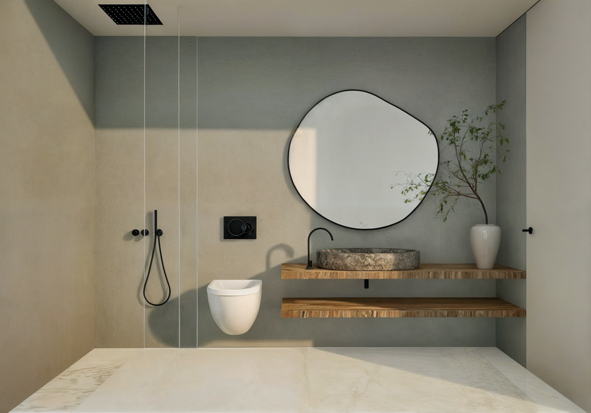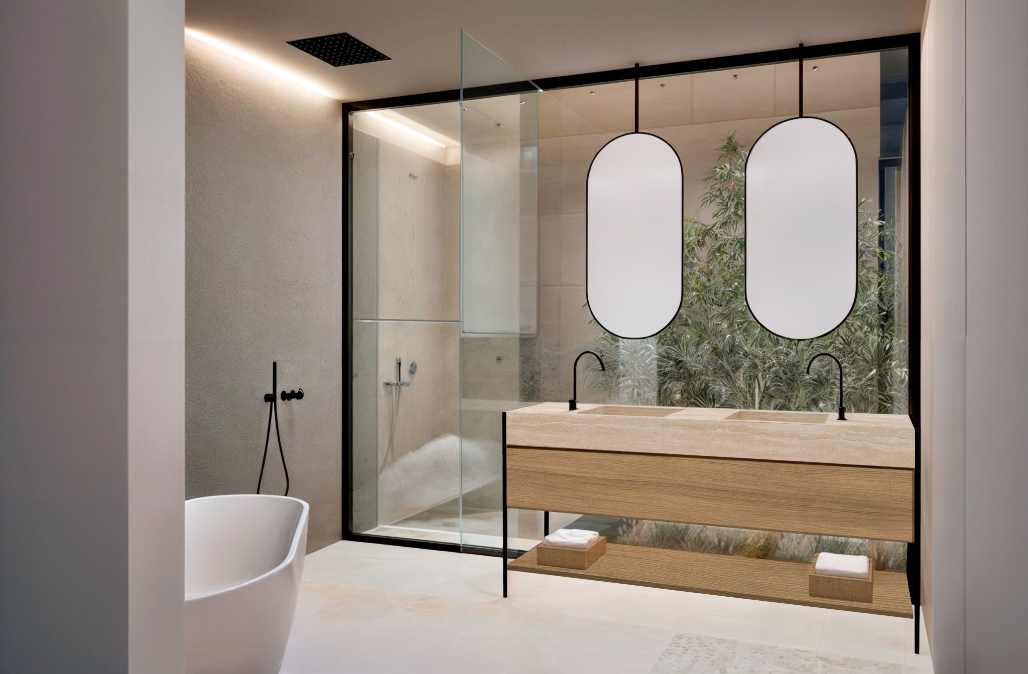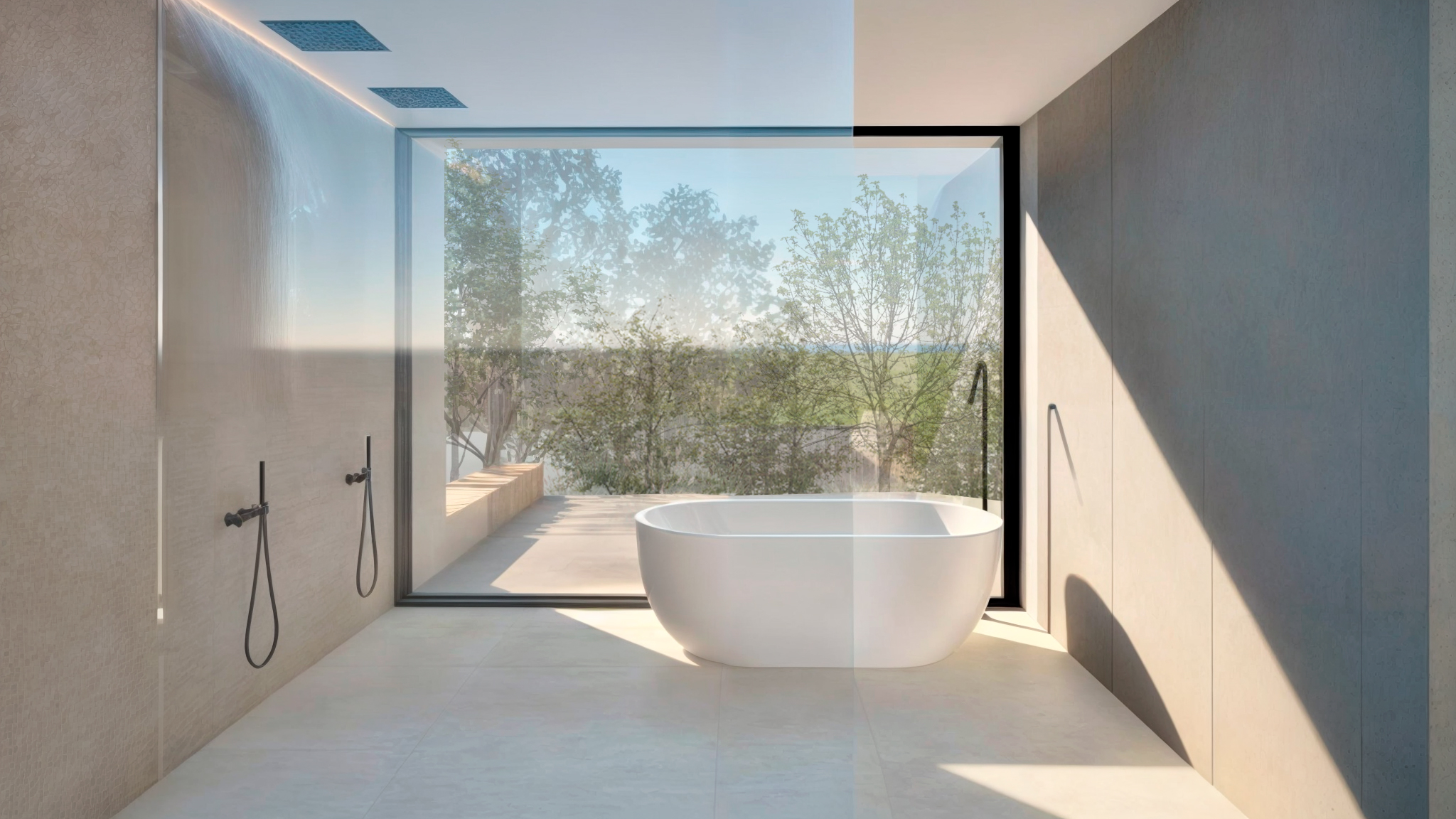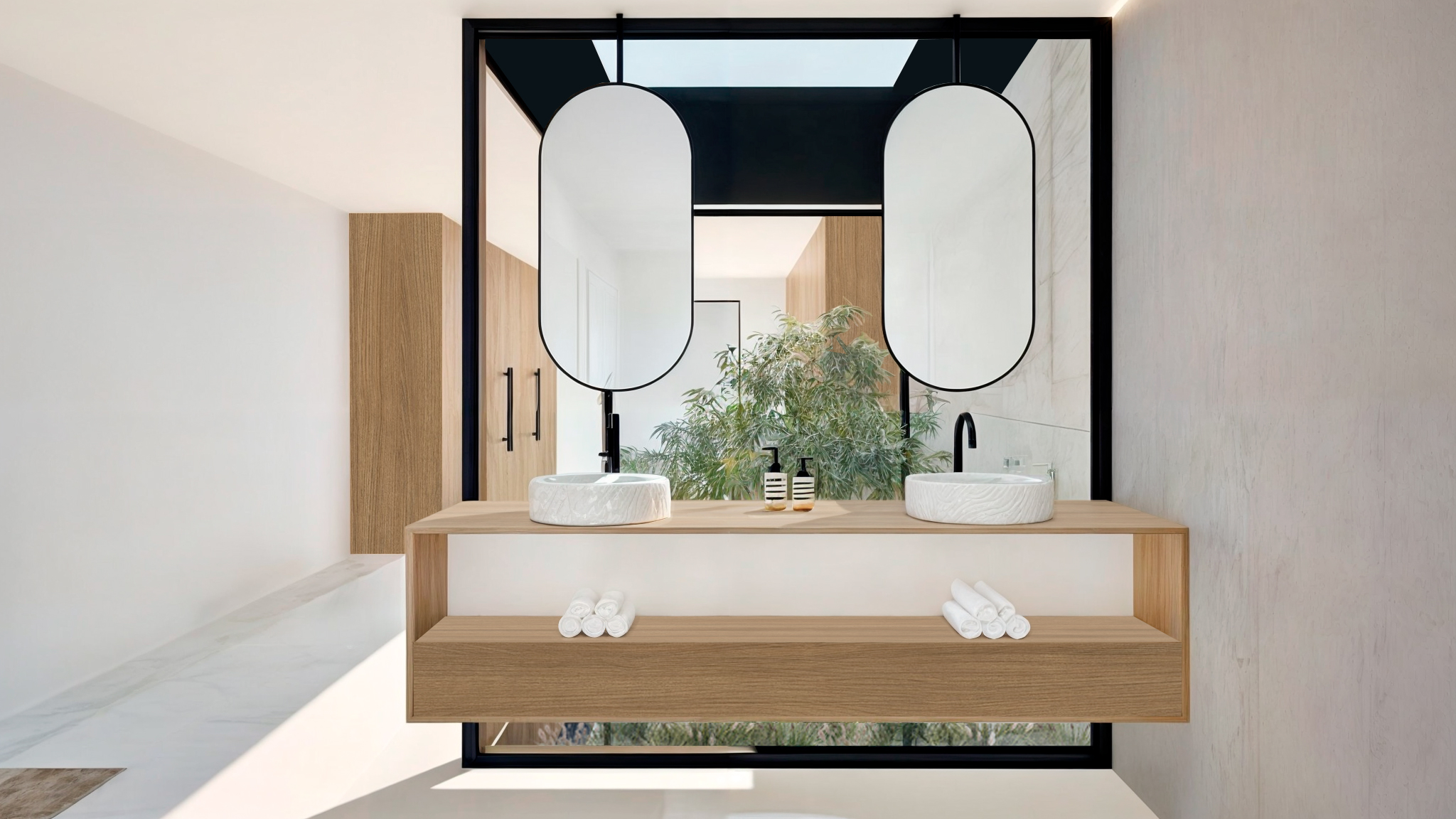 La materialidad acompaña y enfatiza el lenguaje, el hormigón presente en los planos transversales, delimita la secuencia del espacio en el que nos topamos. Los solados de madera aportan calidez y establecen una relación y armonía con los elementos verticales de madera del exterior. Para los espacios de cocina y baño, la base de la arquitectura está presente, pero se añaden pequeñas variaciones en las que jugamos con la geometría, la disposición de los elementos, a pared o superficie horizontal para generar variedad, sin perder la armonía y evitando caer en los caprichos de la decoración.