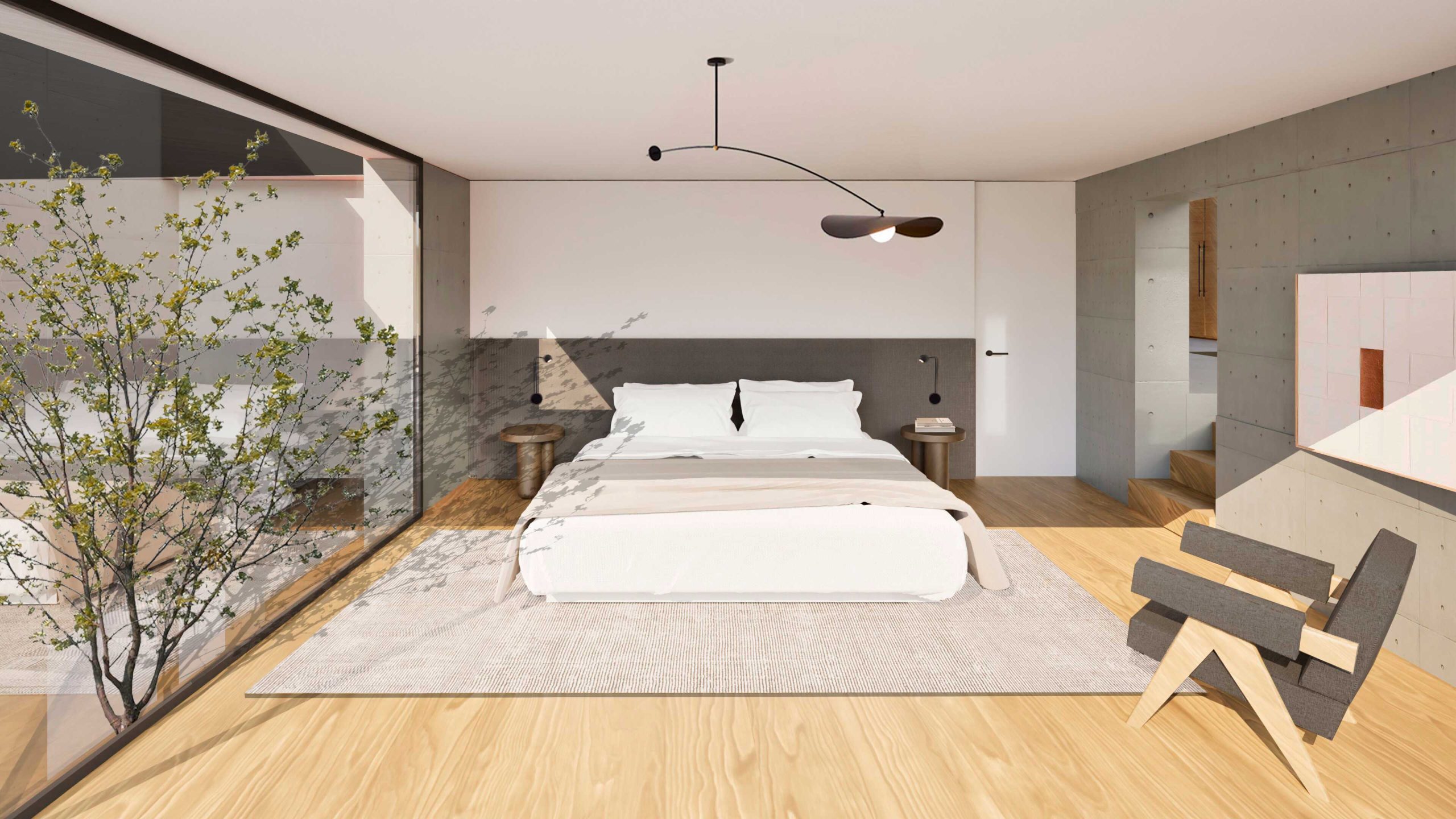 El tercer y cuarto volumen se encuentran lasa habitaciones y zonas privadas de la vivienda, volúmenes que se encuentran en la zona más alta de la parcela y más alejadas de la entrada. Un atrio de doble altura organiza y distribuye los espacios, huyendo de la generación de pasillos, y generando escala, espacio y conexiones visuales en cualquier punto del proyecto. Un espacio que conecta los patios, la doble altura y el salón y cocina a la vez, generando sensación de amplitud y ejes visuales continuos. Escala y Fluidez, constantes en todo el proyecto.